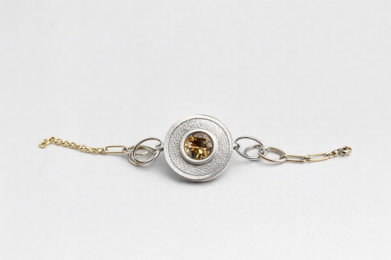 Pulsera de diseño vanguardista. Una pieza audaz que fusiona el brillo del platino con la calidez del oro, coronada por un cristal de Swarovski